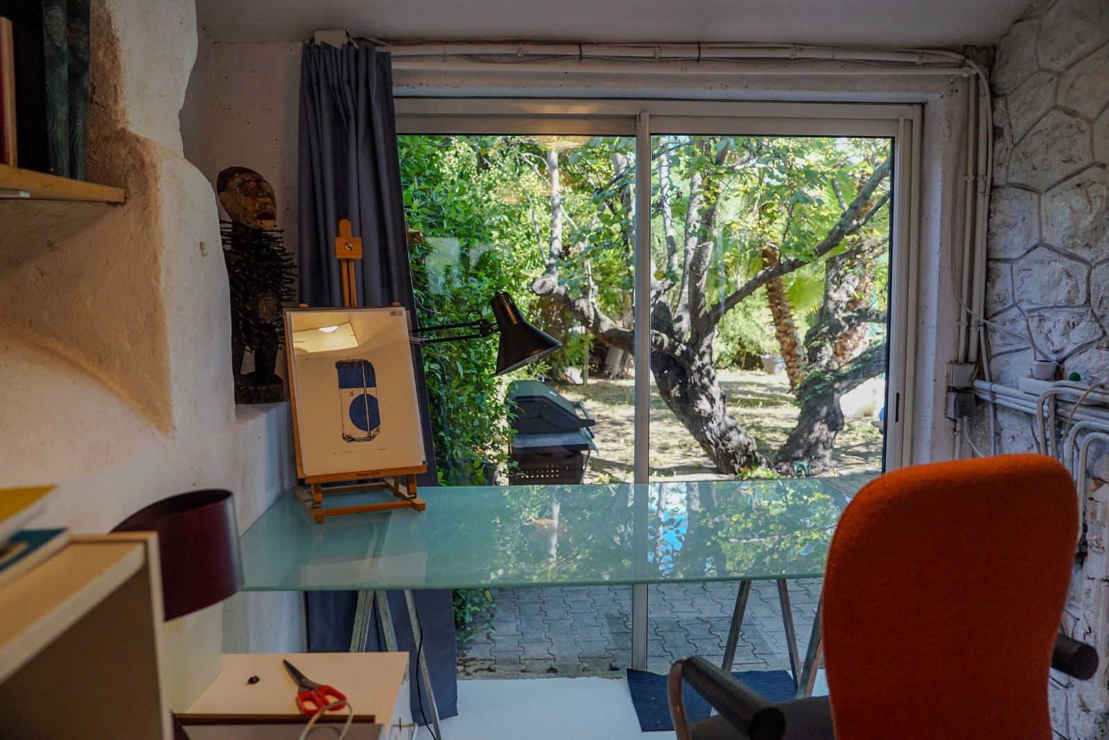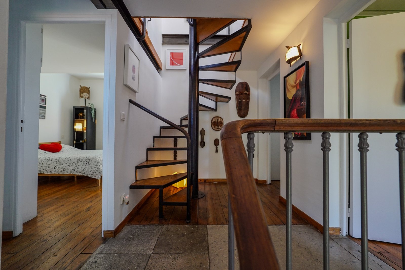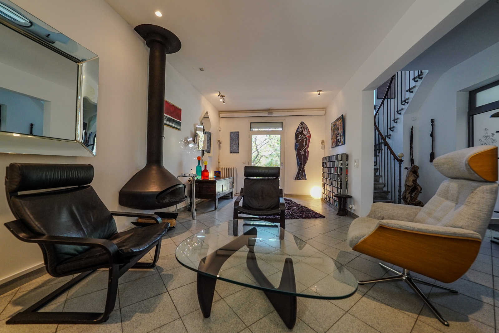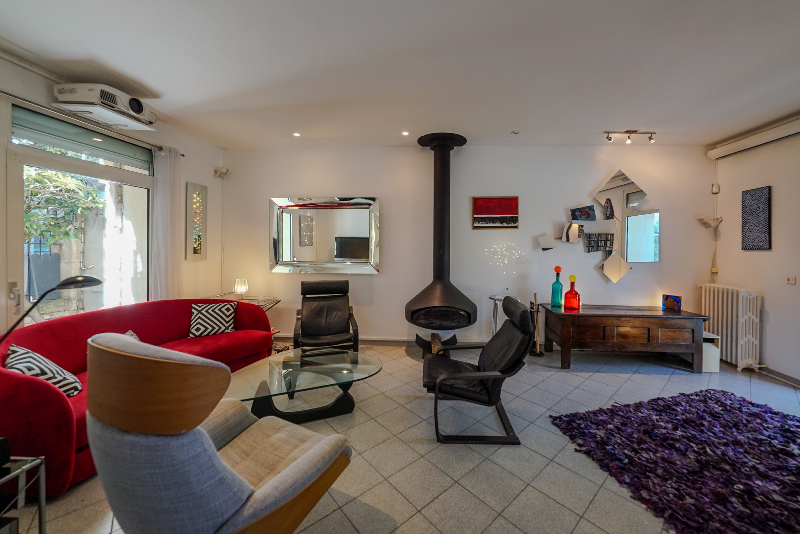 Les matériaux anciens et modernes sont de grande qualité. Il y a dans le salon une cheminée Focus qui souligne la tension ancien-moderne. Quatre chambres, deux salles de bains, deux espaces de travail dont un indépendant et traversant avec accès depuis la rue et vue sur le jardin pouvant accueillir profession libérale, atelier, studio, etc…