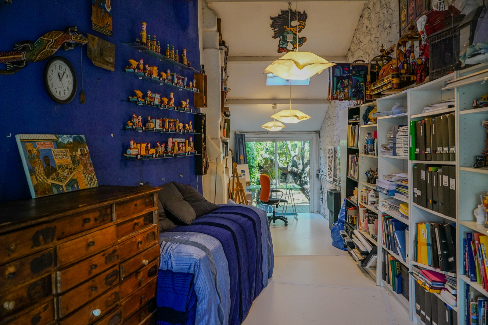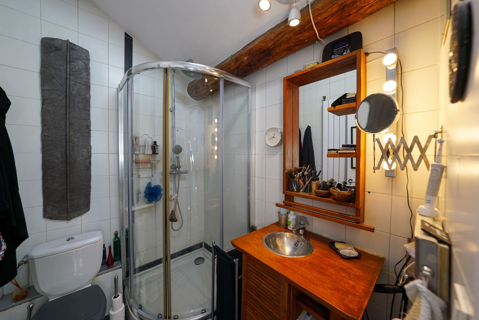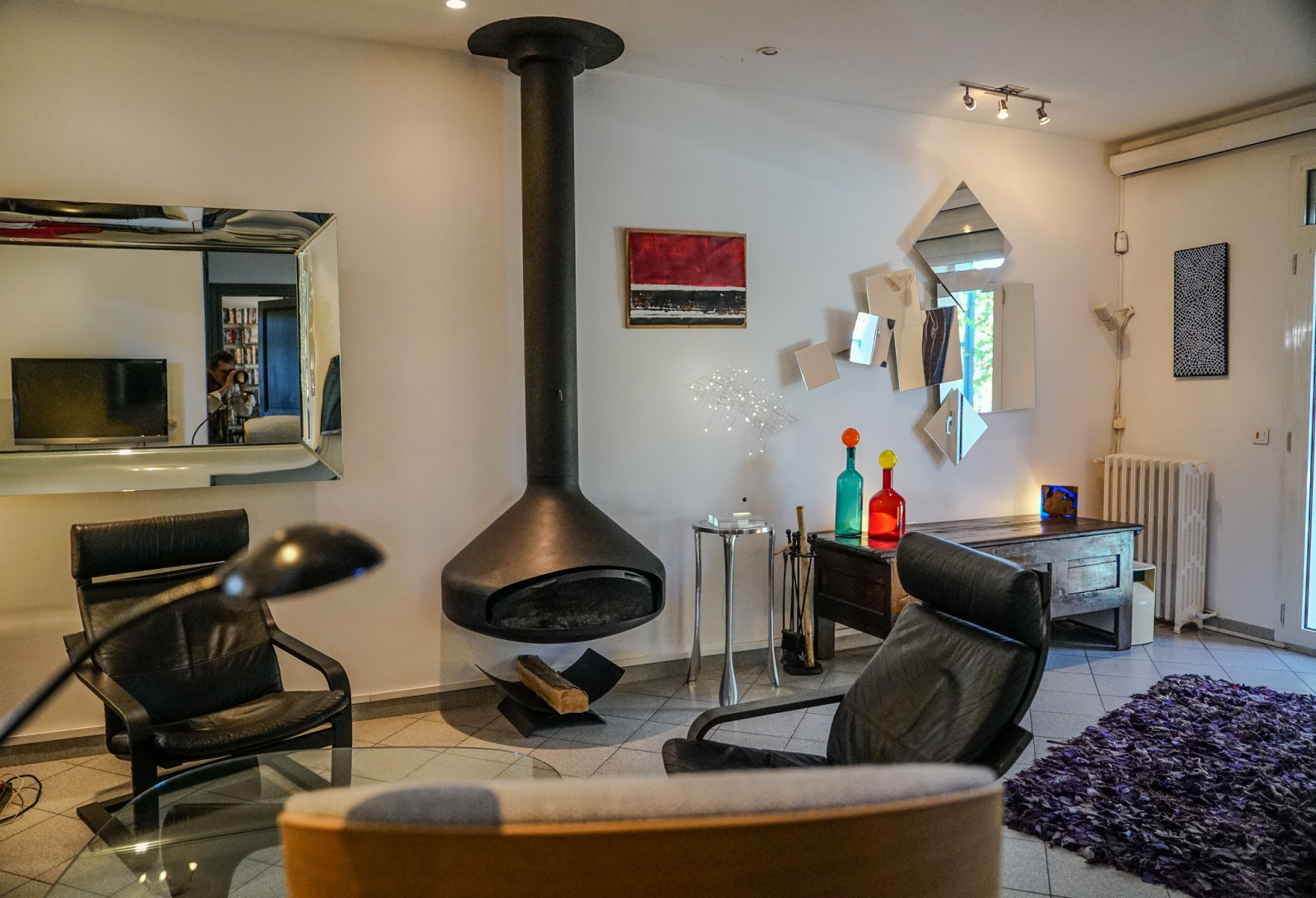 Les matériaux anciens et modernes sont de grande qualité. Il y a dans le salon une cheminée Focus qui souligne la tension ancien-moderne. Quatre chambres, deux salles de bains, deux espaces de travail dont un indépendant et traversant avec accès depuis la rue et vue sur le jardin pouvant accueillir profession libérale, atelier, studio, etc…